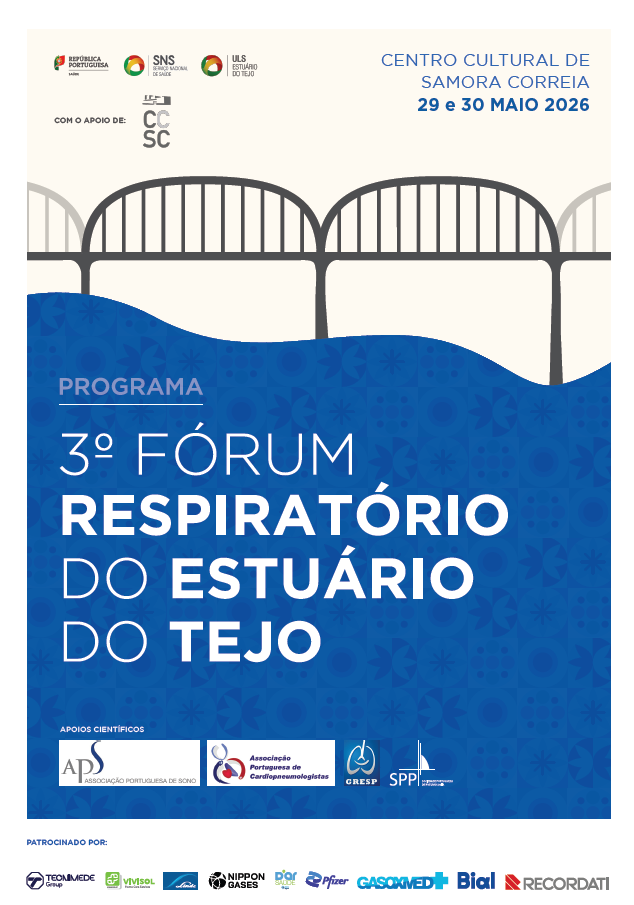 Informamos que a 3ª Edição do Fórum Respiratório do Estuário do Tejo, organizado pelo Serviço de Pneumologia, decorre em nova data, dias 29 e 30 de maio de 2026, no mesmo local, Centro Cultural de Samora Correia.