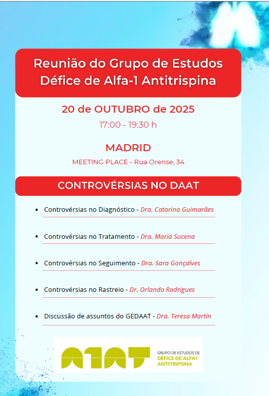 Informamos que a Reunião do Grupo de Estudos de Défice de Alfa1 Antitripsina terá lugar no dia 20 de outubro de 2025, às 17:00, em Madrid.