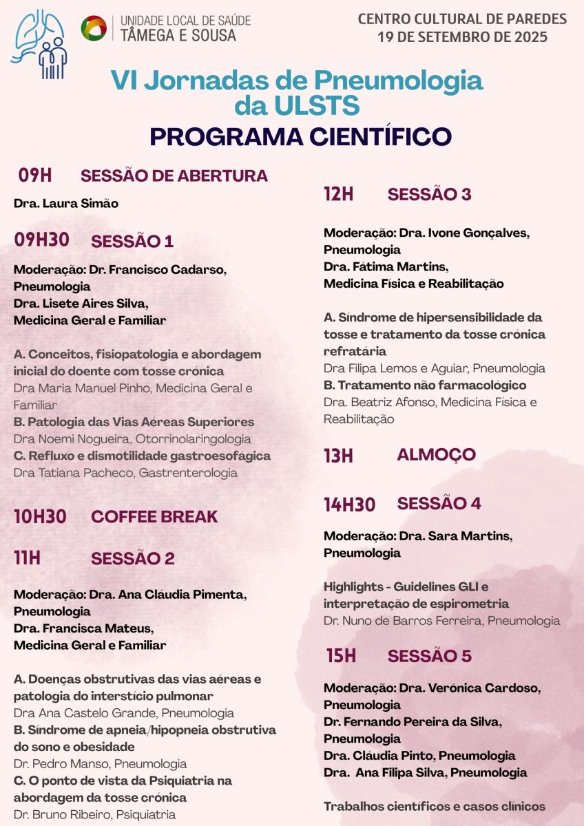 Informamos que o Serviço de Pneumologia da Unidade Local de Saúde do Tâmega e Sousa promove as suas VI Jornadas de Pneumologia. Esta edição é dedicada aos desafios da abordagem prática da tosse crónica.